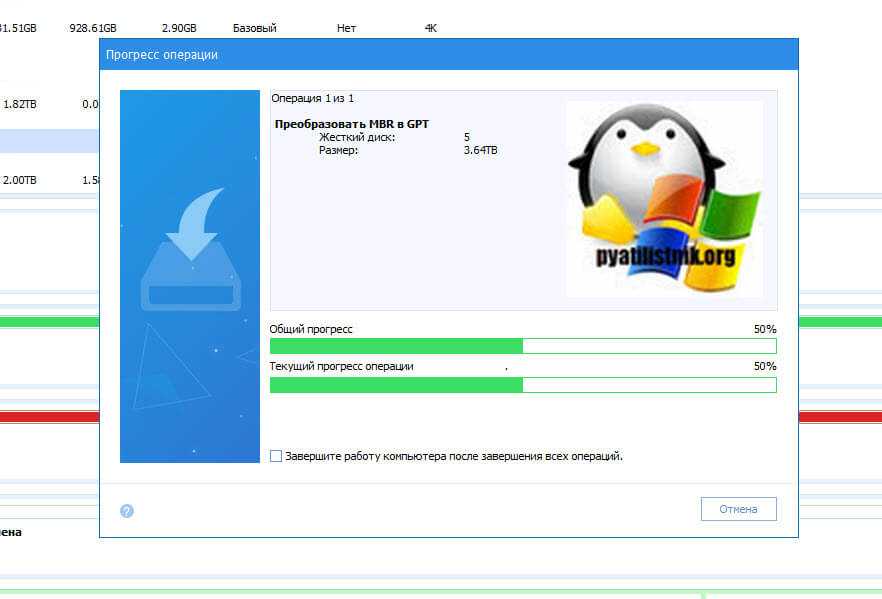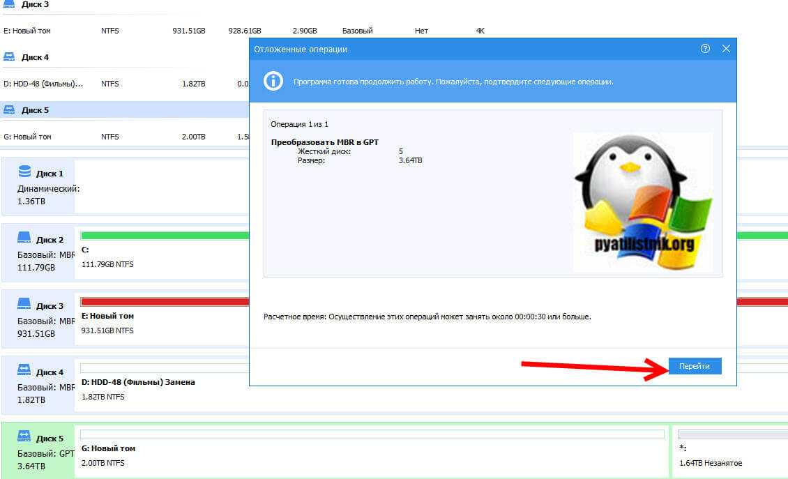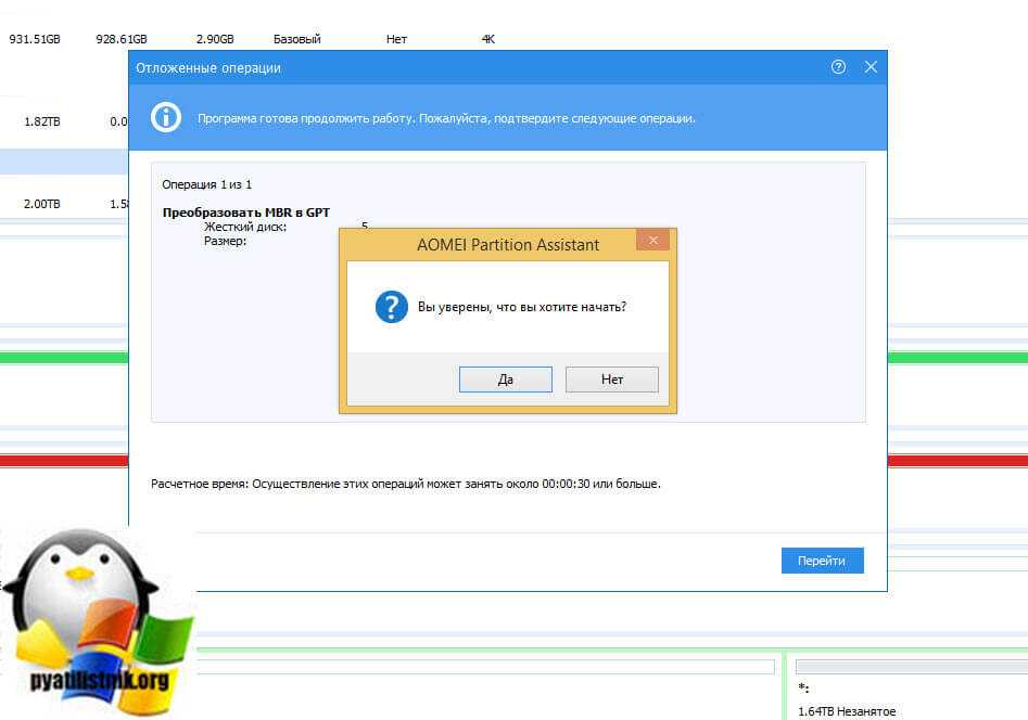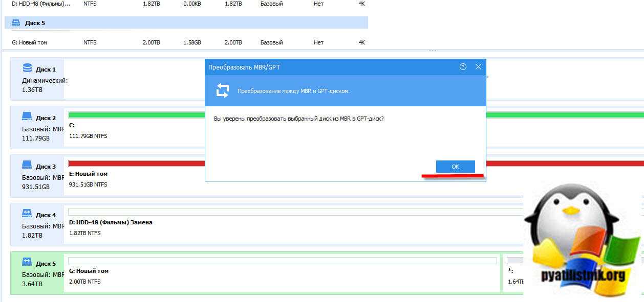 Вас спросят, уверены ли вы что хотите преобразовать диск из MBR в GPT. Естественно соглашаемся с этим.