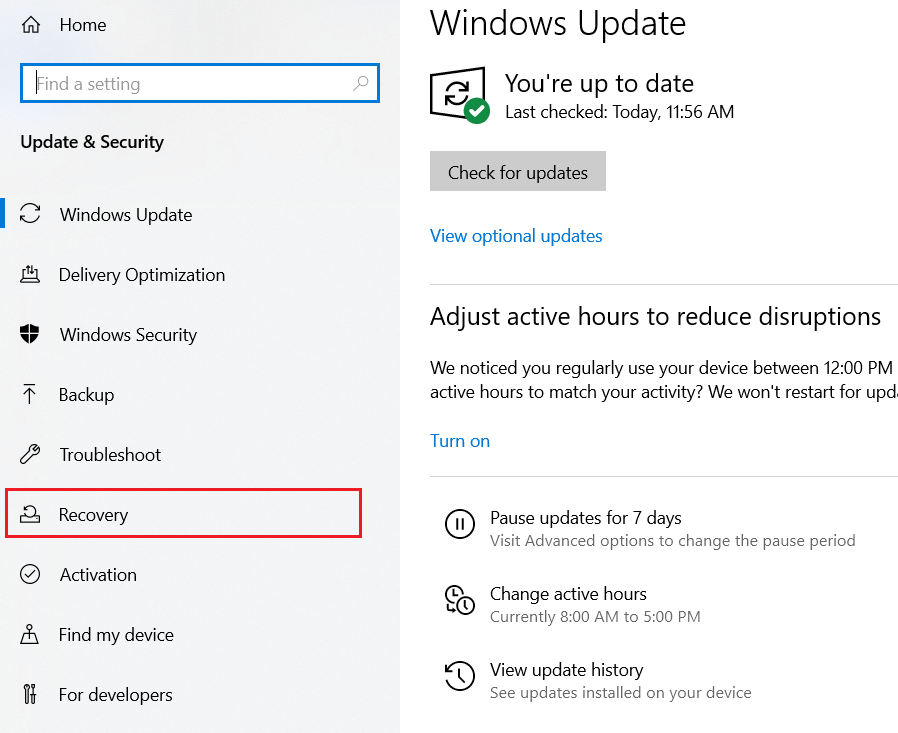 2. In the Update & Security applet, click on Recovery to access the Advanced Recovery Options screen.