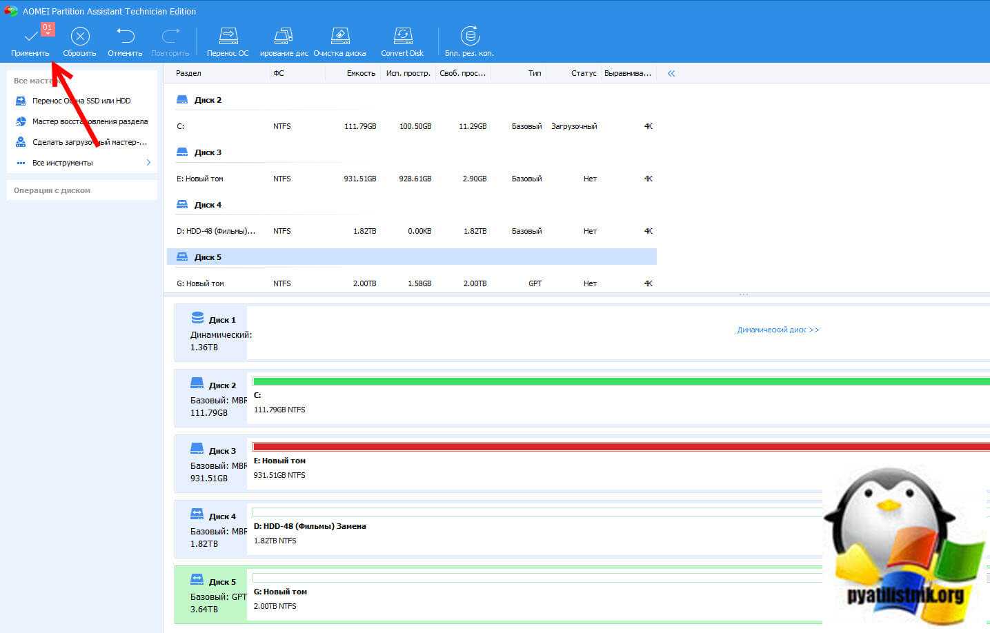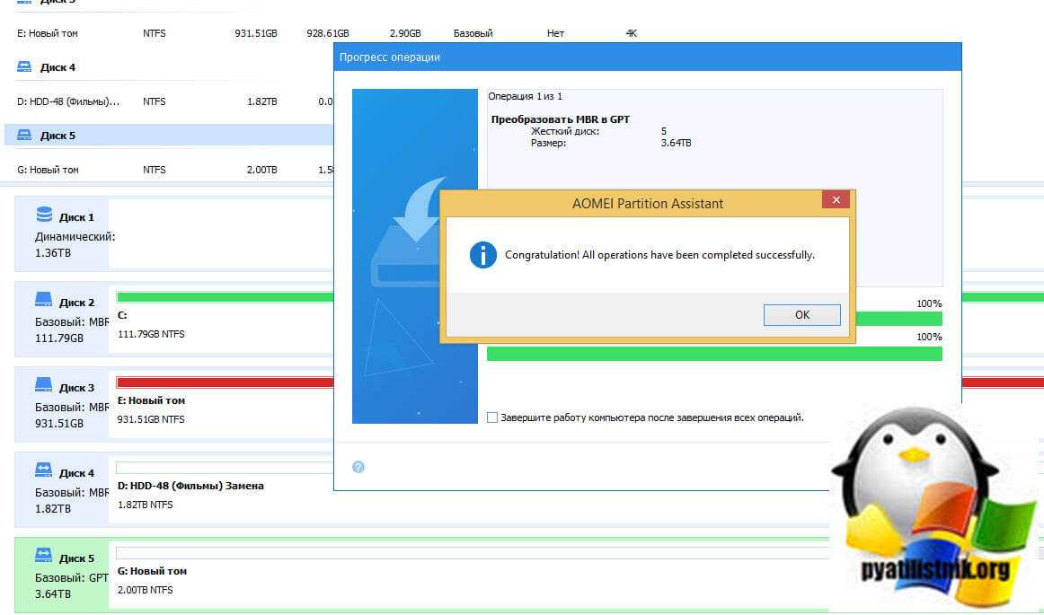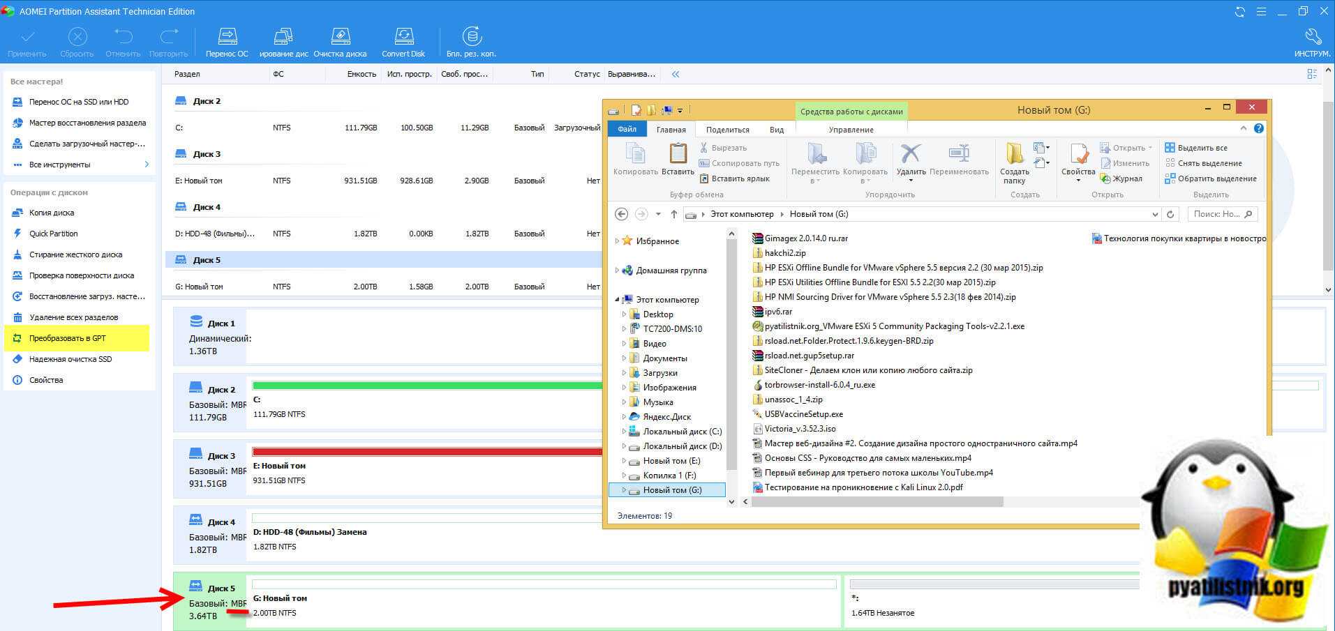 Запустите AOMEI Partition Assistan, у меня есть все тот же диск 5, объемом 3,64ТБ, на нем есть раздел в 2ТБ и некоторое количество данных. Обязательно выбирайте именно диск, он выделен зеленым цветом, далее найдите пункт «Преобразовать в GPT».