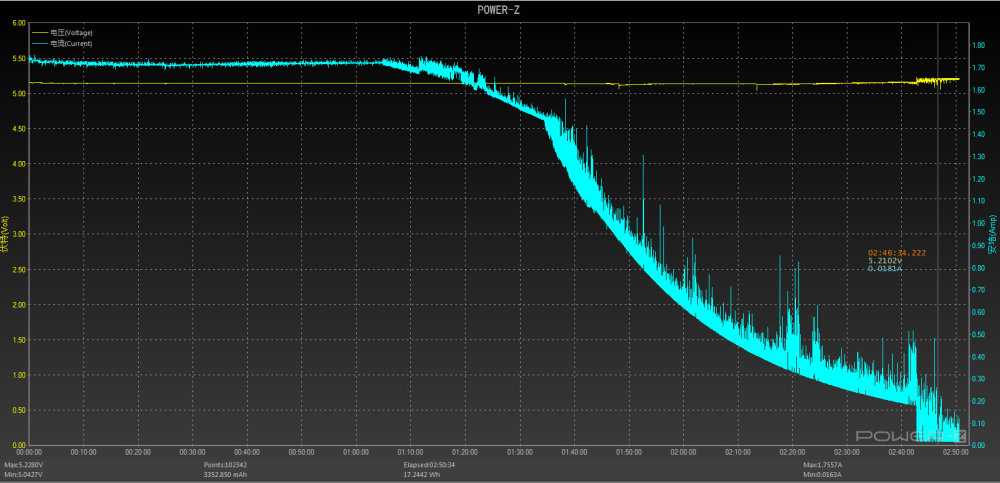 График ниже показывает, что максимальный ток во время зарядки выключенного аппарата составляет примерно 1,72 Ампера, а полностью смартфон заряжается за 2 часа 43 минуты.