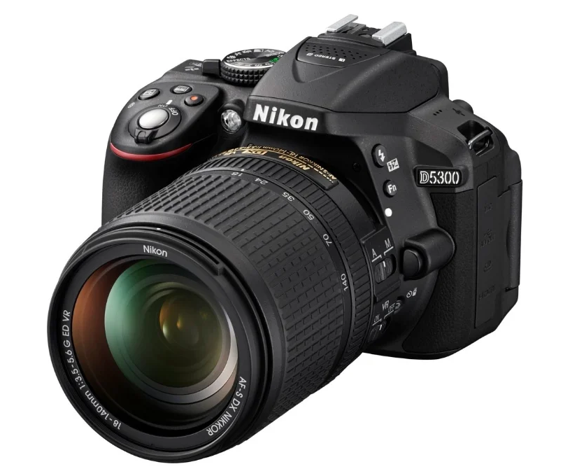 Этот неплохой компактный фотоаппарат для начинающих имеет размеры 125×98×76 мм и вес «тушки» 480 грамм без элементов питания или 530 с ними. Устройство оснащено 3.2-дюймовым поворотным дисплеем с разрешением свыше миллиона точек. Также в этой зеркалке есть модули Wi-Fi и GPS, отсутствующие в младших моделях. Управление Nikon D5300 несложное, и быстро в нём разберётся даже начинающий.