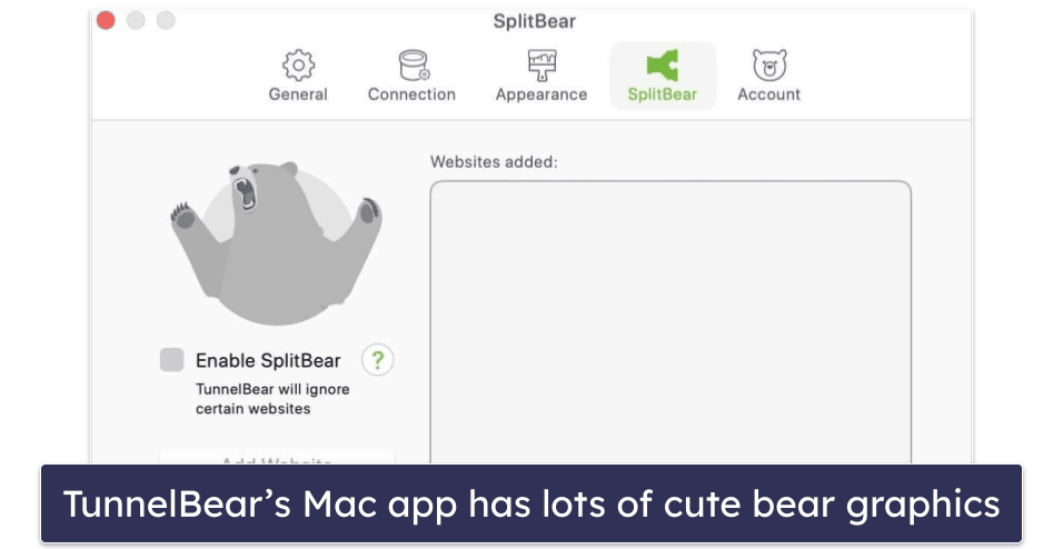 TunnelBear has a sleek, fun, and easy-to-use interface for macOS devices — I really love that there are cute animated bears and silly bear puns all over the Mac app.