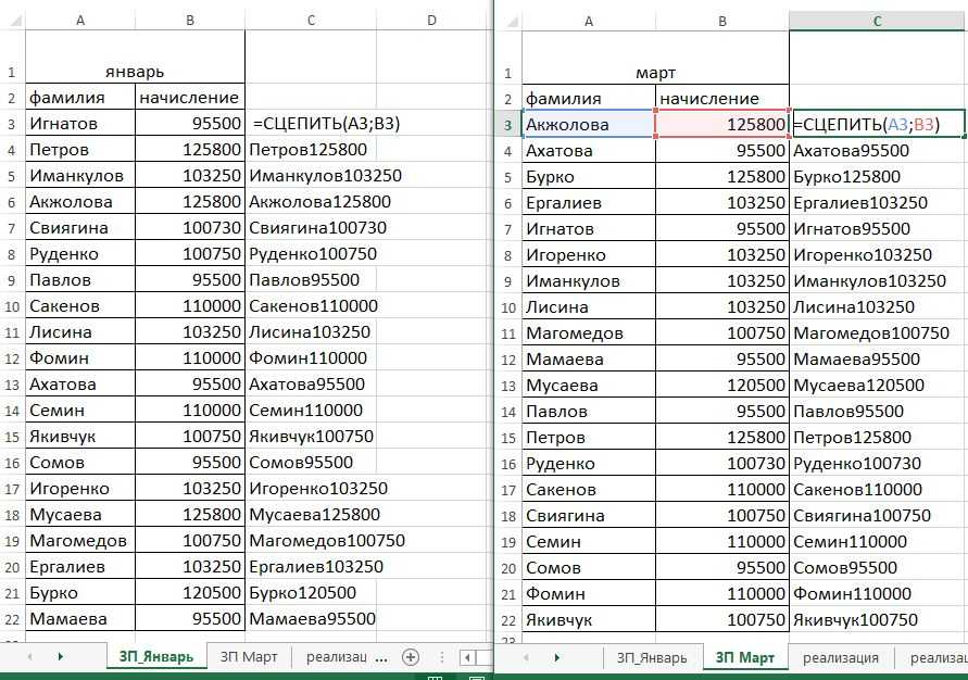 - В новых столбцах используя формулу =СЦЕПИТЬ