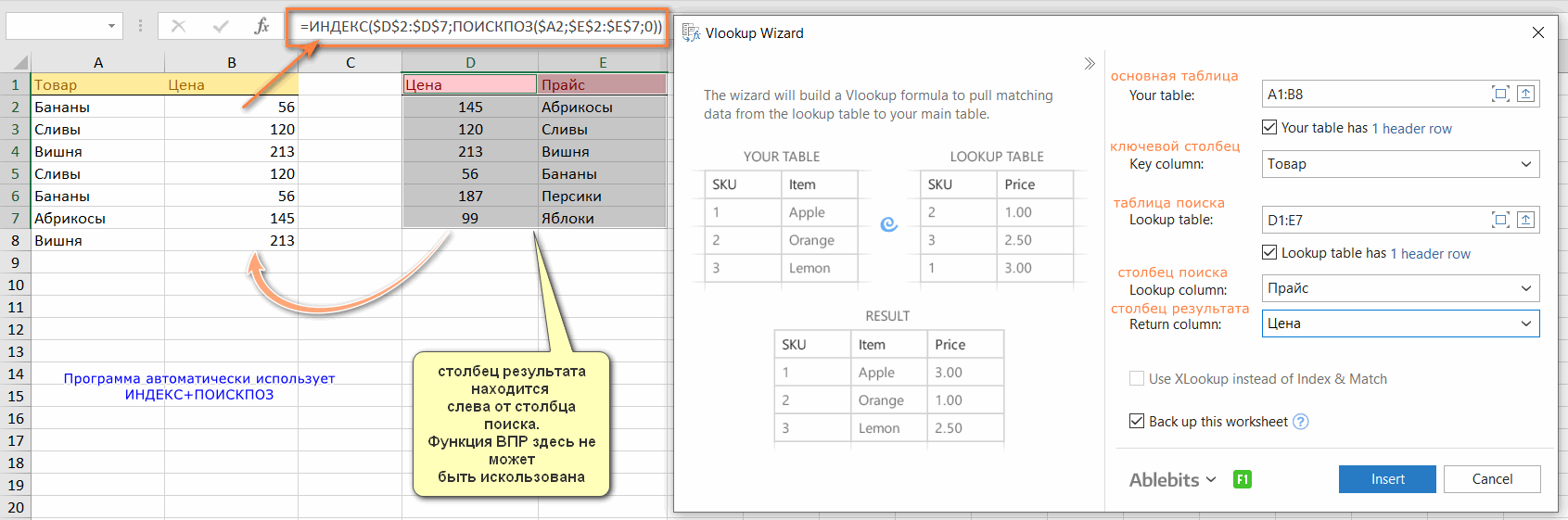 Когда колонка результата (Цена) находится слева от области поиска (Прайс), то мастер автоматически вставляет формулу ИНДЕКС+ПОИСКПОЗ: