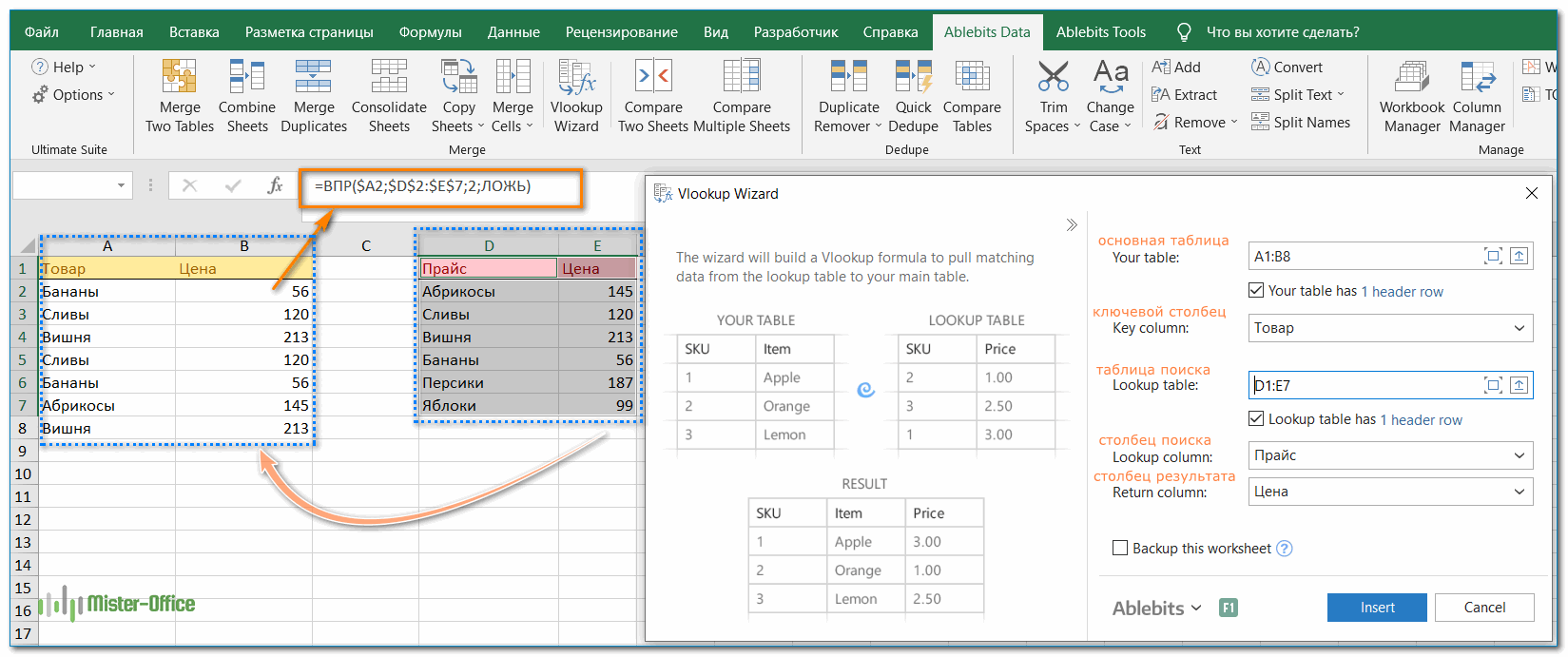 - Запустите мастер кнопкой Vlookup Wizard на ленте Ablebits Data.