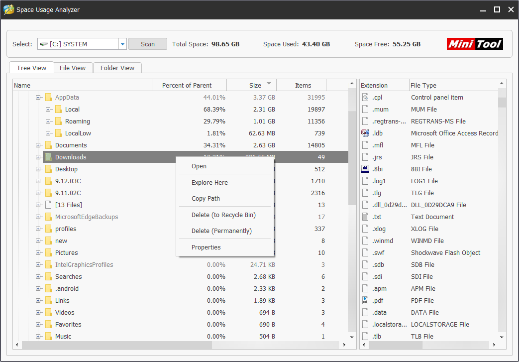 In case the hard drive is filled up, you may clean up some unnecessary files, especially those with large file sizes, to free up some storage space. Check how to easily check which files have large file sizes on your hard drive and choose to delete them with MiniTool Partition Wizard space analyzer feature below.