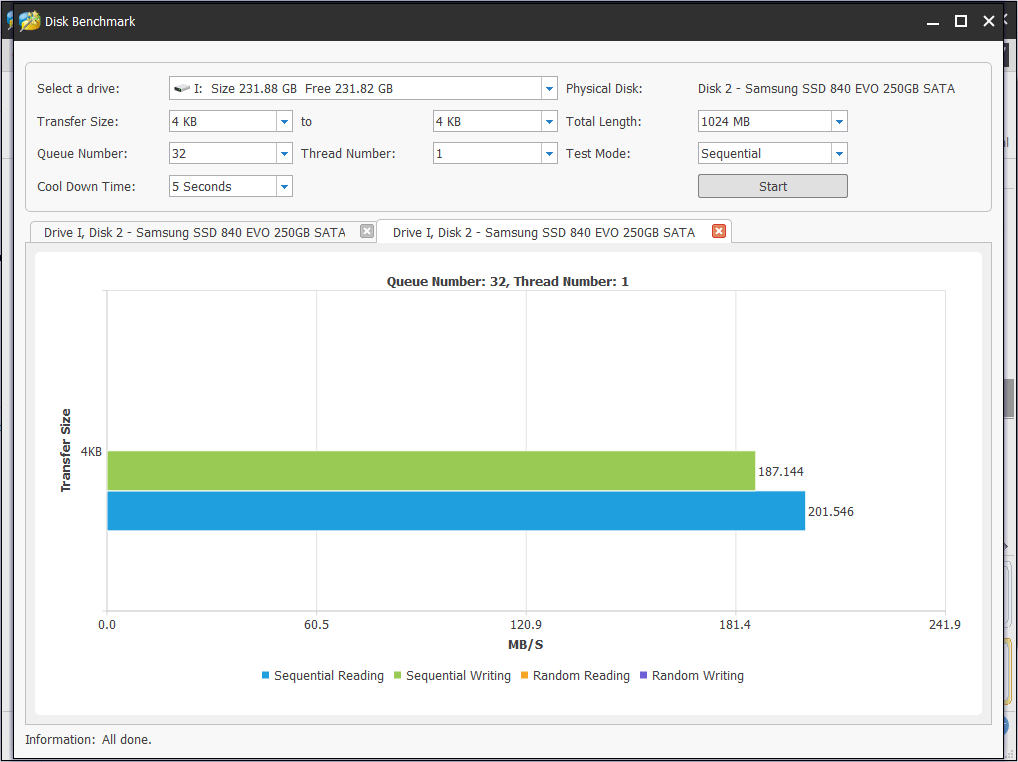 Click Start to begin testing the hard drive or SSD read and write speed with the hard disk/SSD speed test tool for Windows 10/8/7. Different test settings may take different time. After it finishes the speed testing of the hard disk or SSD, it will show you an intuitive graphical table.