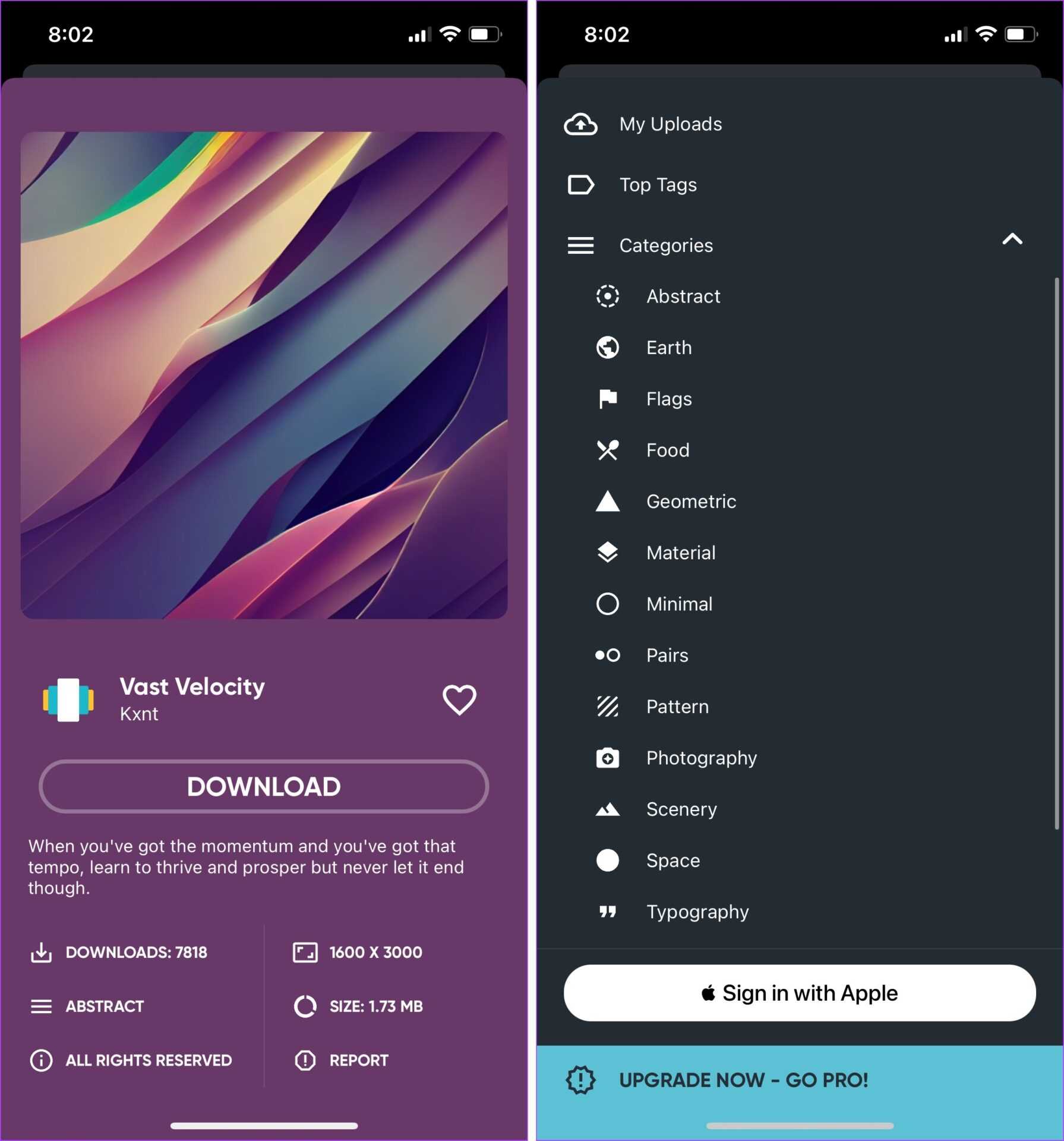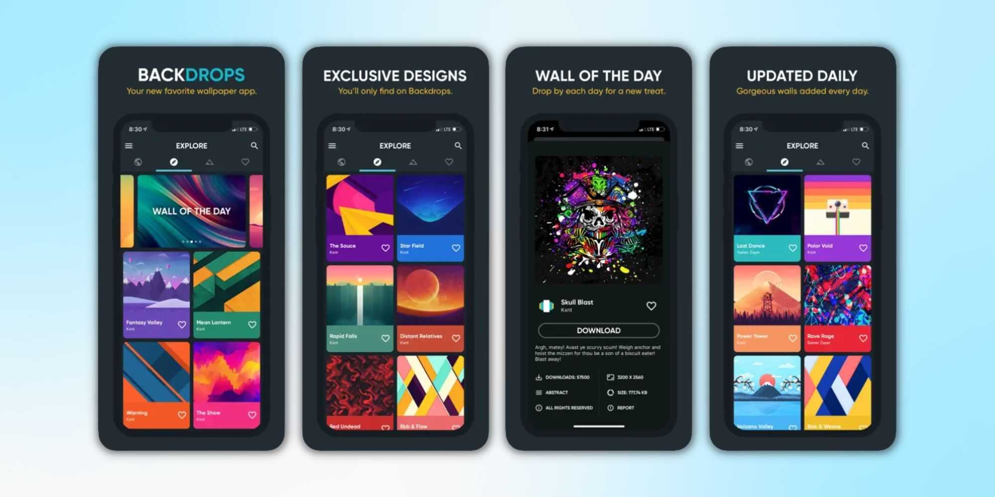 Приложение Backdrops имеет средний рейтинг 4,7 звезды от более чем 1300 пользователей. Он предлагает одни из самых крутых абстрактных обоев и занимает всего около 15 МБ памяти. Он открывается прямо на странице «Обзор», где пользователи могут прокручивать, чтобы просмотреть коллекцию. Каждые обои имеют имя и отображают количество загрузок, разрешение и размер. Несмотря на то, что это бесплатное приложение, оно не показывает слишком много рекламы. Однако преимущество приложения также является его слабым местом – большинство обоев абстрактны, и в каталоге сложно найти что-то реалистичное. Премиум-версия Backdrops без рекламы стоит 3,99 доллара США и приобретается единоразово.