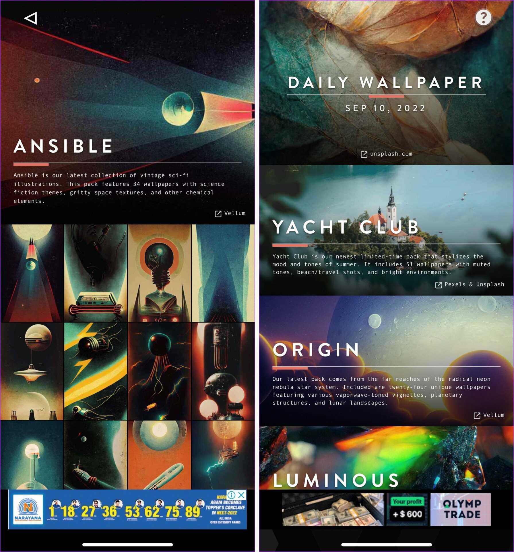 Walli — это отличное место, где можно найти простые, но потрясающе выглядящие обои. Есть несколько отличных категорий на выбор, а вкладка «Популярные» просто потрясающая. Единственное, что мне не нравится в этом приложении, так это то, что оно содержит много рекламы, что довольно раздражает.