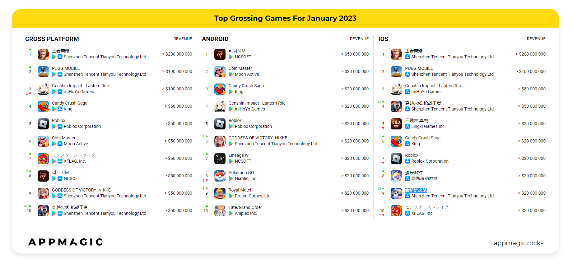 В топ-10 самых кассовых игр на обеих мобильных платформах впервые за очень долгое время попал шутер CrossFire: Gunfight King (穿越火线:枪战王者). Проект больше восьми лет на рынке. Все это время он хорошо зарабатывал (в пике до $33 млн). Однако в этом январе его выручка резко подскочила до $56 млн. Благодаря этому игра попала в топ-10 мобильных игр по совокупной выручке.