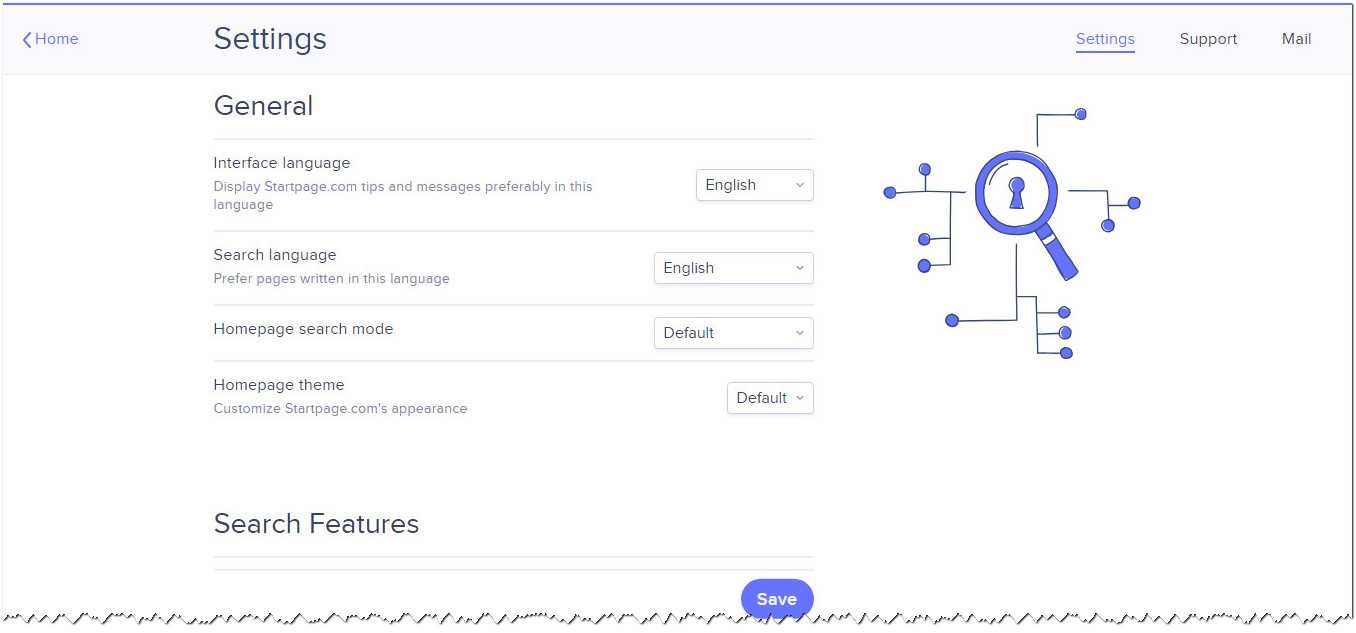 • Используется шифрование SSL/PFS.• Файлы cookies используются только для хранения настроек Startpage.• Поисковик не собирает статистические данные и не отслеживает IP-адрес.• Поддерживает поисковые прокси.• Поисковик доступен из сети Tor.• Наличие сертификата ЕС о конфиденциальности.• Физически сервера располагаются в Нидерландах.• Гибкие настройки поиска.• Возможность смены тем оформления.