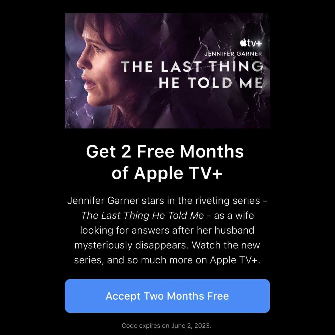 В честь выхода на tv+ детективного сериала «Последнее, что он сказал мне» с участием Дженнифер Гарнер, Apple раздает 2 бесплатных месяца подписки на сервис (для тех, у кого нет действующей подписки):