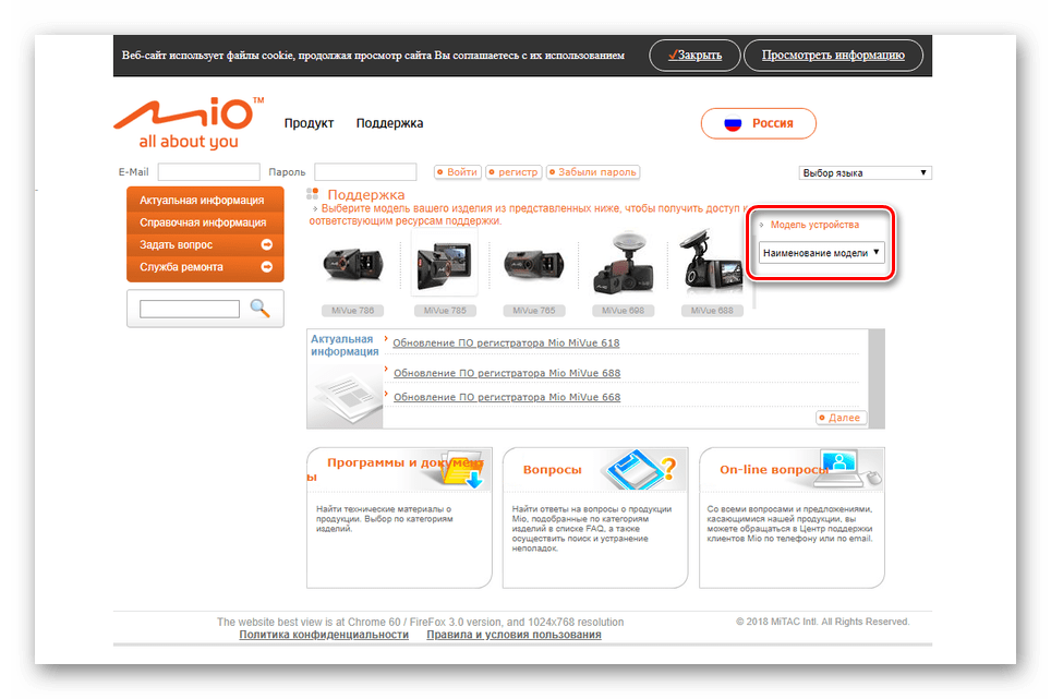 - Воспользовавшись указанной нами ссылкой, на странице поддержки MIO разверните меню «Модель устройства».