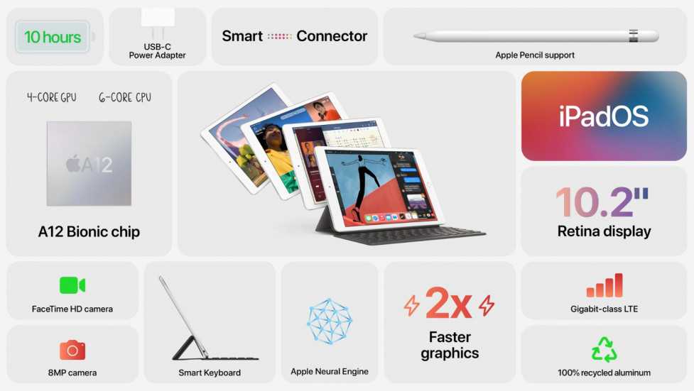 Форм-фактор обновленного iPad 8 в точности такой же, как и у его предшественника iPad 7-го поколения. Чип A12 Bionic от iPhone Xs на самом деле все еще мощный даже в 2020-м году — с 6-ядерным центральным процессором и 4-ядерным графическим процессором. В Apple заявили, что по сравнению с iPad 7 процессор нового iPad 8-го поколения на 40% быстрее, а обработка графики происходит быстрее в 2 раза. Процессор A12 Bionic содержит внутри себя 8-ядерный нейропроцессор Neural Engine, использующийся для машинного обучения и способен выполнять до 5 триллионов операций в секунду.