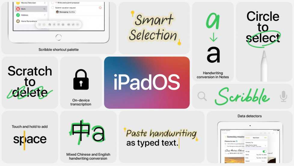 Например при работе стилусом Apple Pencil на iPad 8 есть режим распознавания рукописного текста, позволяющий мгновенно переводить рукописный текст в печатный. Также iPad 8 распознает фигуры и поэтому даже небрежно нарисованные от руки стилусом круги или звезды или другие фигуры быстро распознаются и превращаются Айпэдом 8 в четкие формы. Режим умного выбора (Smart Selection) понимает разницу между рукописными буквами и рисунками.