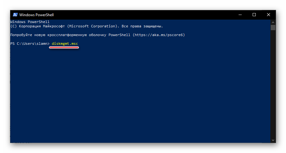 Windows PowerShell – более функциональный аналог «Командной строки», ставший одним из множества нововведений десятой версии операционной системы от Microsoft. Им поддерживается большинство команд для консоли и та, что предназначена для вызова «Управления дисками», не является исключением.