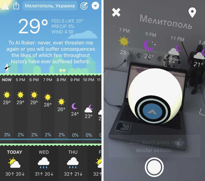 CARROT Weather — это погодный информер, в который встроен настоящий робот. Его ИИ нацелен на то, чтобы поднять вам настроение, поэтому он будет регулярно подбрасывать шутки, которые будут задевать в том числе и вас (например, он будет постоянно называть ваши пальцы сосисками).