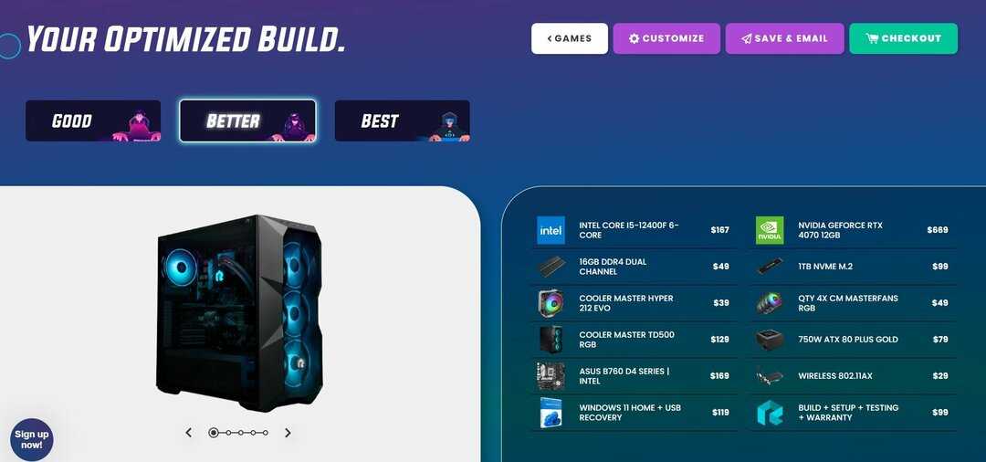 Это лучший из всех пользовательских интерфейсов, которые мы видели. Это современный, удобный и первый выбор среди всех вариантов. Всего за четыре простых шага вы можете настроить всю свою систему и даже купить компоненты непосредственно у них. Нам показалось неудобным отсутствие выпадающего меню для переключения или выбора различных компонентов по нашему выбору. В противном случае вы можете попробовать этот веб-сайт, если вы спешите и хотите быстро собрать компьютер.