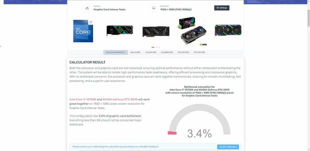 Он отображает результат расчета, использование и решения для устранения узких мест. Результат расчета показывает, какой компонент слабее, чем какой компонент. Например, видеокарта X слабее процессора Y при разрешении экрана Z. Он также отображает процент узкого места в выбранной конфигурации.