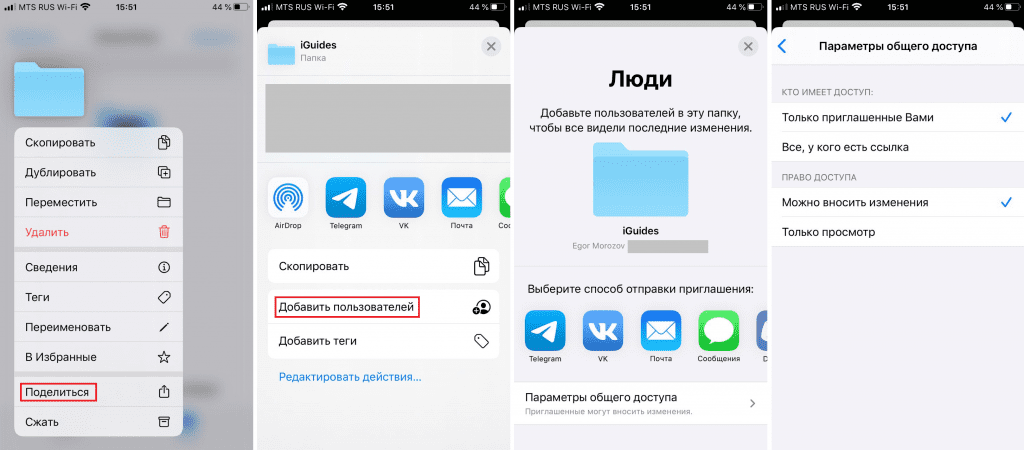 Если папка содержит информацию личного пользования и в ней нет ничего интересного для посторонних, она выглядит как обычно. Чтобы поделиться информацией в папке необходимо выбрать Поделиться. Сразу откроется возможность добавлять пользователей или удалять ненужных и назначать права доступа для конкретных папок. Доступ к ним получат или приглашённые пользователи или люди с ссылкой доступа.