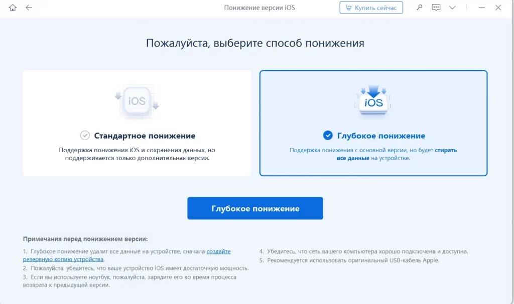 6. Выберите «Глубокое понижение», потому что стандартное в нашем случае не сработает, оно актуально при откате в границах разных версий iOS 15;