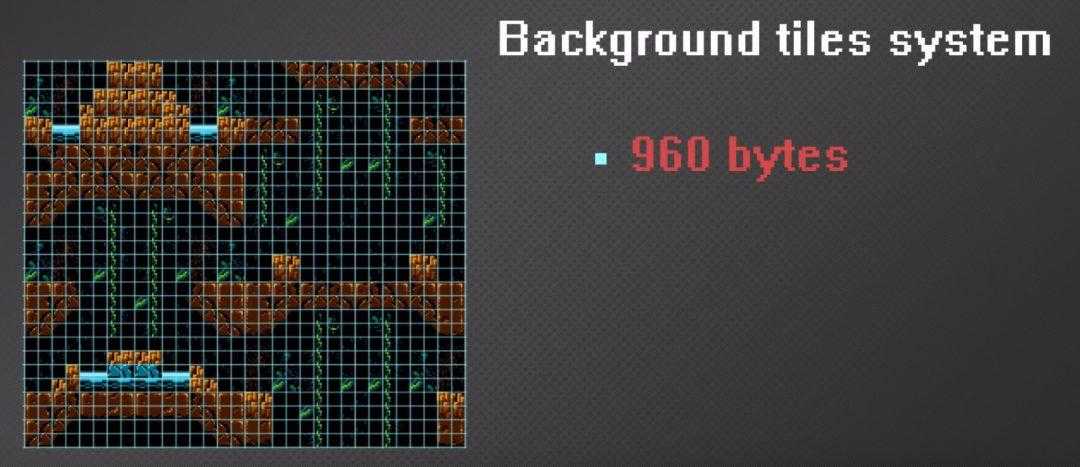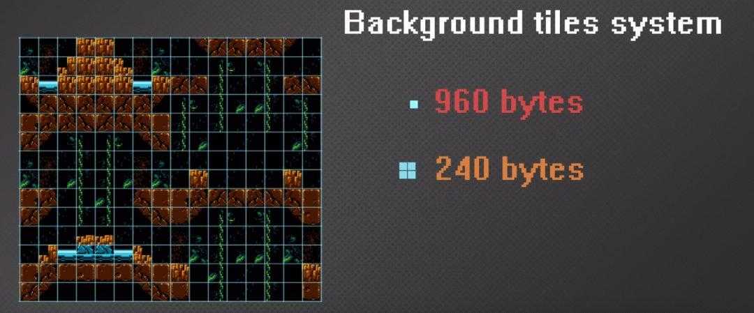 Если разбить просто на квадратики 8 × 8, как в памяти, то вся видимая на экране часть уровня займёт 960 байт. Это почти килобайт, и это очень много.