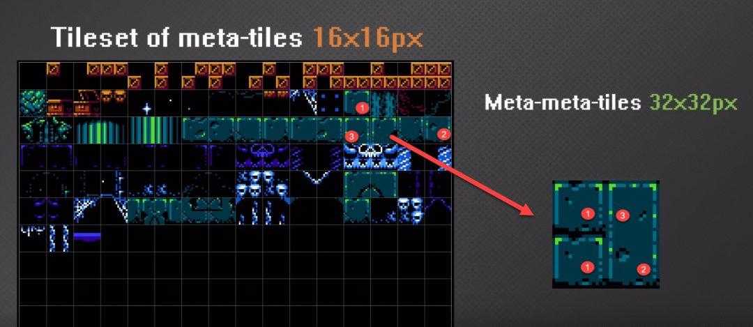 Разбивают уровень на метаплитки 16 × 16. Теперь на одну карту нужно 240 байт, чтобы пометить каждую такую метаплитку, но это всё равно много. Уменьшаем дальше.