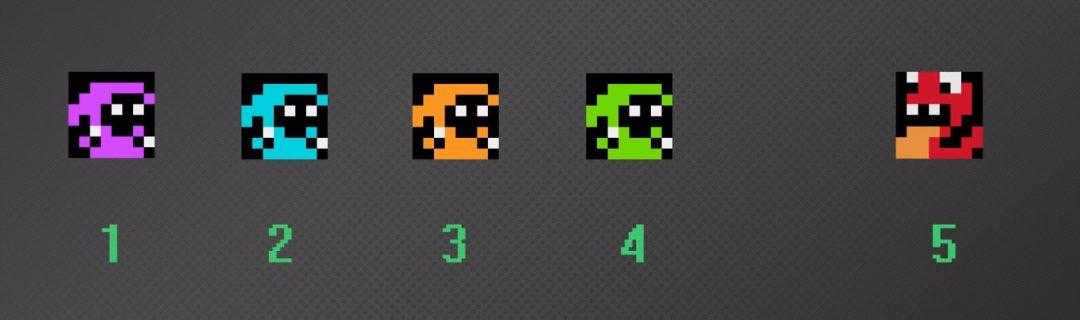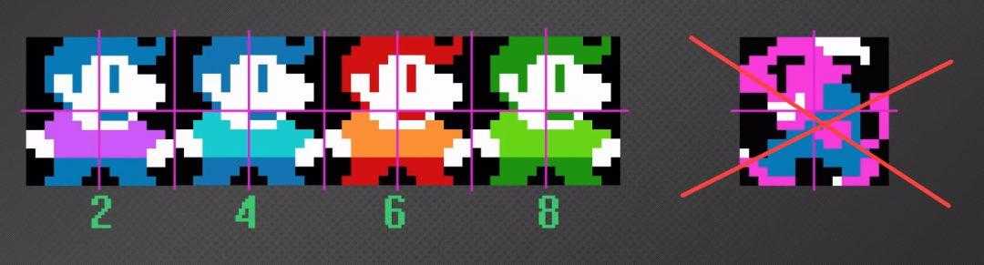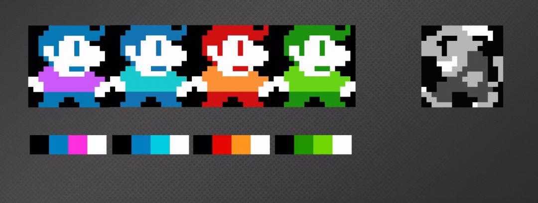 Приставка может использовать одновременно только 4 вида палитры, поэтому у нас получается 4 цветных главных героя и нераскрашенный злодей.