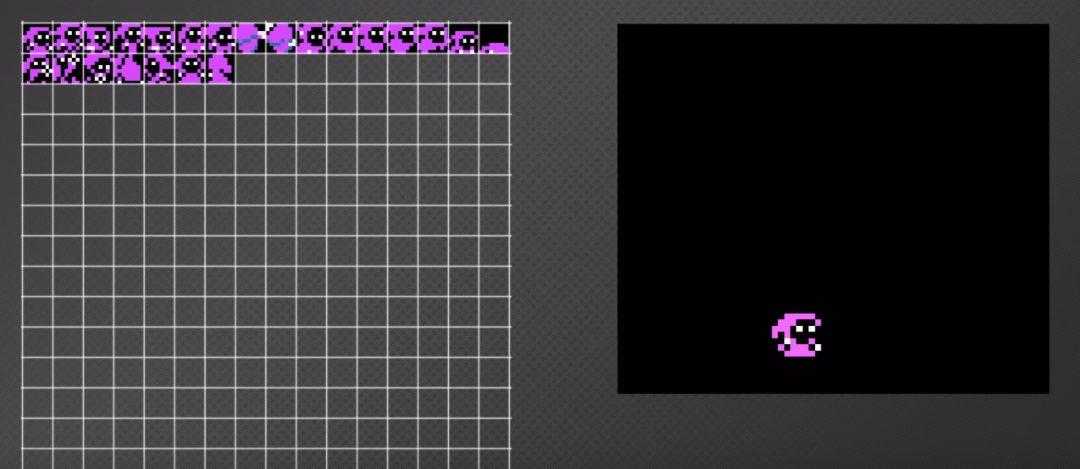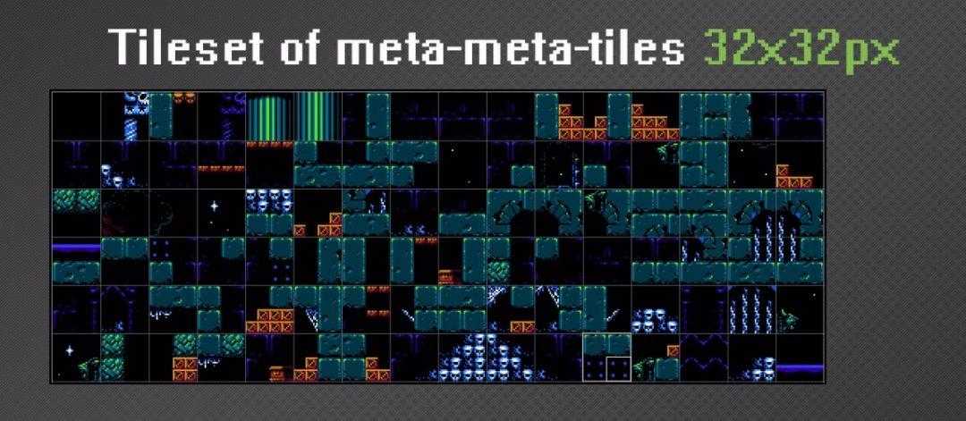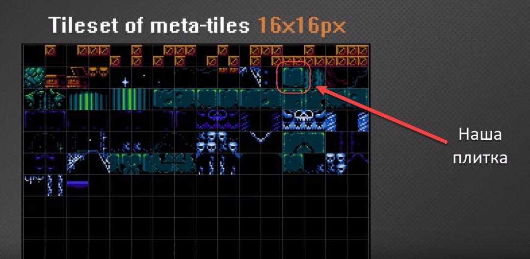 Главная задача на этом этапе — максимальная экономия видеопамяти. Для этого каждый экран с уровнем игры разбивается не на метаплитки 2 × 2, как в примере выше, с персонажем, а на метаметаплитки или суперплитки — 4 × 4 ячейки. Вот для чего это нужно:
