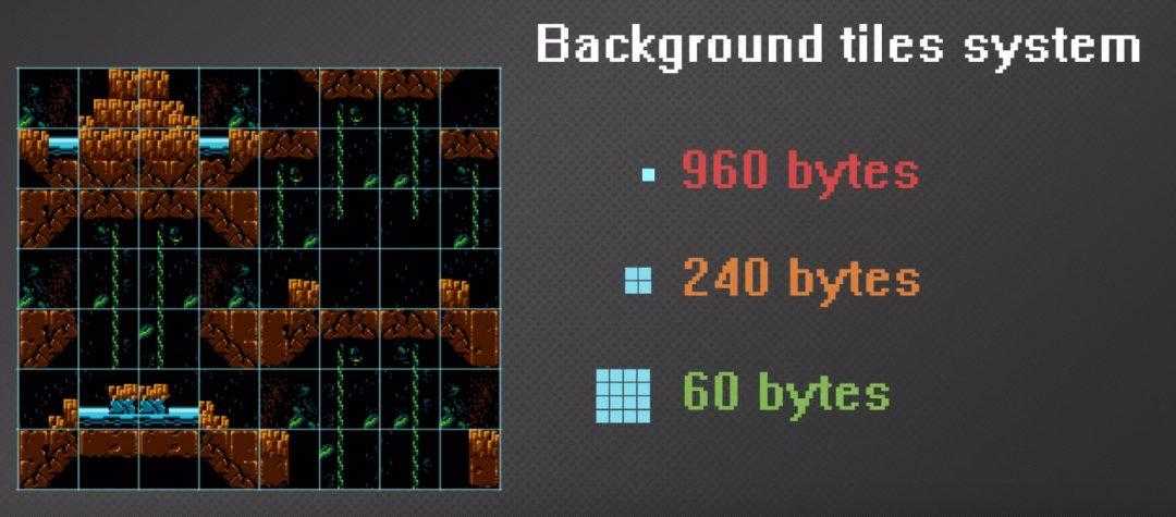 Уровень можно поменять так: берут исходную картинку, накладывают сверху новые детали и получают сложную локацию. В среднем на это уходит по 7 байт на каждый экран.
