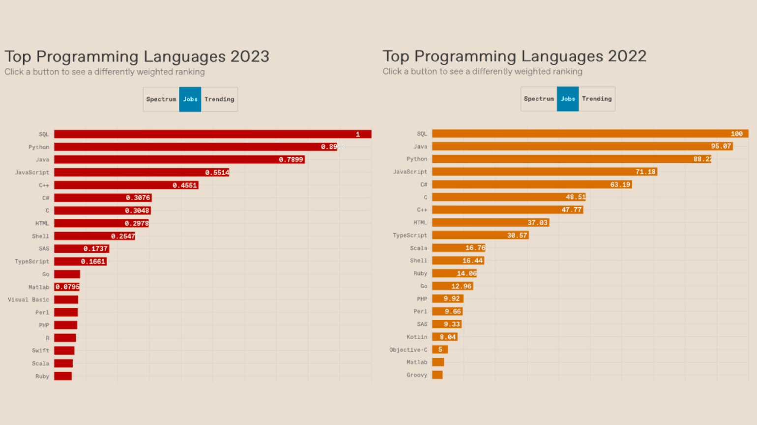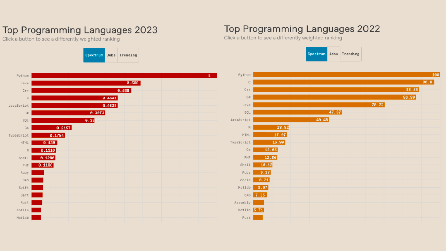 В 2023 году абсолютное лидерство по популярности среди разработчиков досталось Python. Язык не потерял своих позиций по сравнению с прошлым годом. Специалисты IEEE Spectrum считают, что причина успеха кроется в распространённости среди школьников и росте количества проектов на базе ИИ.
