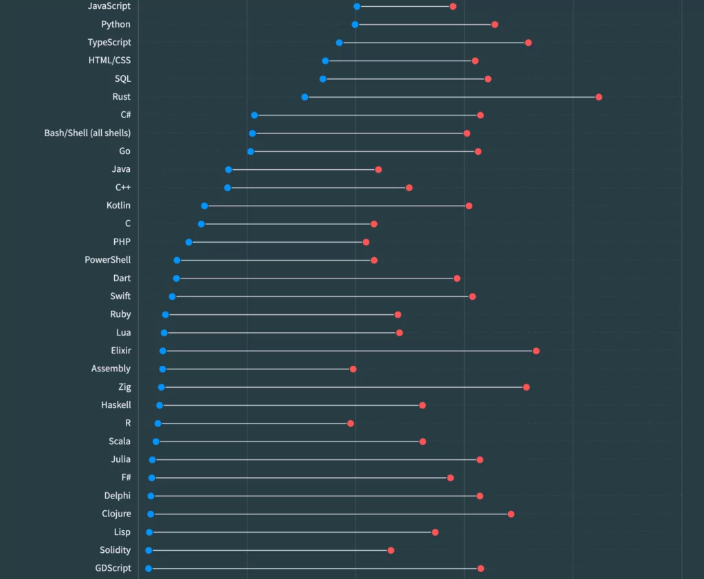 В опросе приняли участие около 90 000 разработчиков со всего мира. На изображении синими точками показано сколько процентов опрошенных хотят использовать тот или иной язык. Красные же точки отмеряют сколько процентов респондентов уже пишут на нем хотели бы продолжить его использовать и дальше.