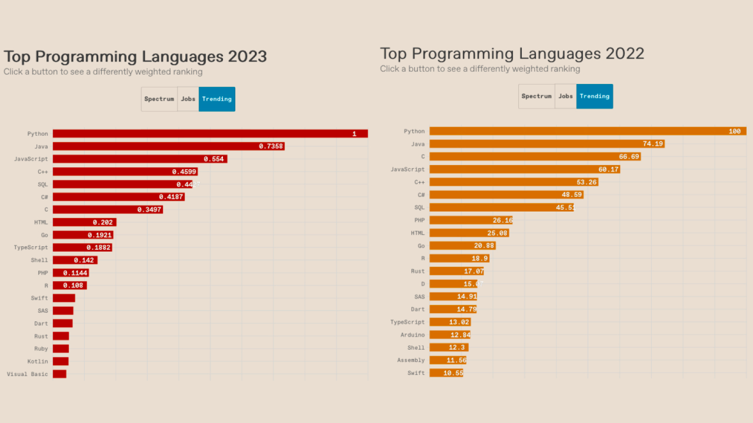 В рейтинге роста популярности (Trending) лидирует, как и в прошлом году, Python. За ним следуют Java, JavaScript, C++ и SQL. По мнению авторов рейтинга, начинающие разработчики могут быть уверены, что Python будет востребован ещё долгое время. Компании активно используют его в веб-разработке, машинном обучении и других сферах и пока не готовы отказываться от этой технологии.