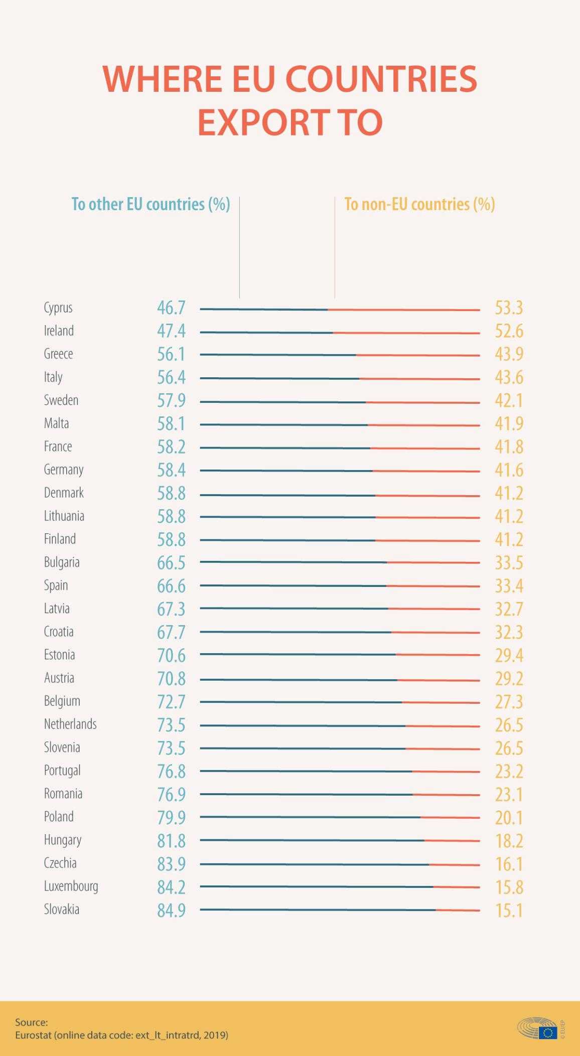 Эпоха США оставался наиболее распространенным направлением для товаров, экспортируемых из ЕС в 2020 году с долей 18.3%. Соединенное Королевство было вторым по величине направлением экспорта ЕС (14.4% от общего объема ЕС), за ним следует Китай (10.5%).