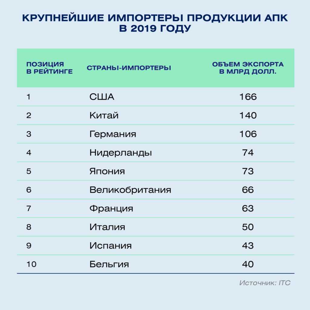 В топ-10 крупнейших мировых импортеров продукции АПК изменений также не произошло, причем ни по составу участников, ни по их позициям в рейтинге. Статус крупнейшего покупателя агропродукции остается у США, в 2019 году показатель увеличился 2% до 166 млрд долл. Китай, второй глобальный импортер продовольственных товаров, нарастил ввоз сразу на 11% до 140 млрд долл. Импорт в Германию, занимающую третье место, снизился на 27% до 106 млрд долл.