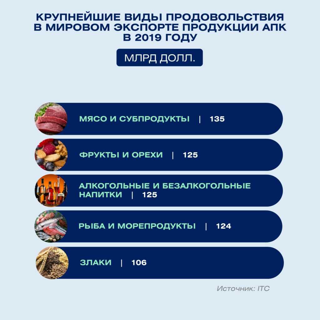 Структура российского продовольственного экспорта существенно отличается от мирового. Почти 70% приходится на продукты из 3 основных групп: зерновые, рыба и морепродукты и продукция масложировой отрасли. Таким образом, российская продукция практически не представлена в крупнейших сегментах мировой торговли: мяса, фруктов и орехов, а также напитков. Для ускоренного роста экспорта АПК у России есть потенциал быстрого увеличения поставок мясной продукции, минеральной воды и безалкогольных напитков.
