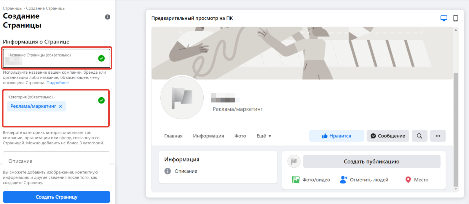 В завершение кликаете «Создать страницу» внизу. Далее появится уведомление, что страница создана и вы можете продолжить редактирование. На предварительном просмотре вверху справа можно увидеть, как будет выглядеть ваша страница на ПК и на мобильном телефоне.