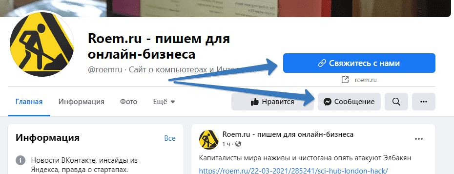 В данном случае кнопка “Свяжитесь с нами” ведёт на форму обратной связи на сайте, а кнопка “Сообщение” позволяет отправить сообщение администраторам страницы внутри соц. сети.