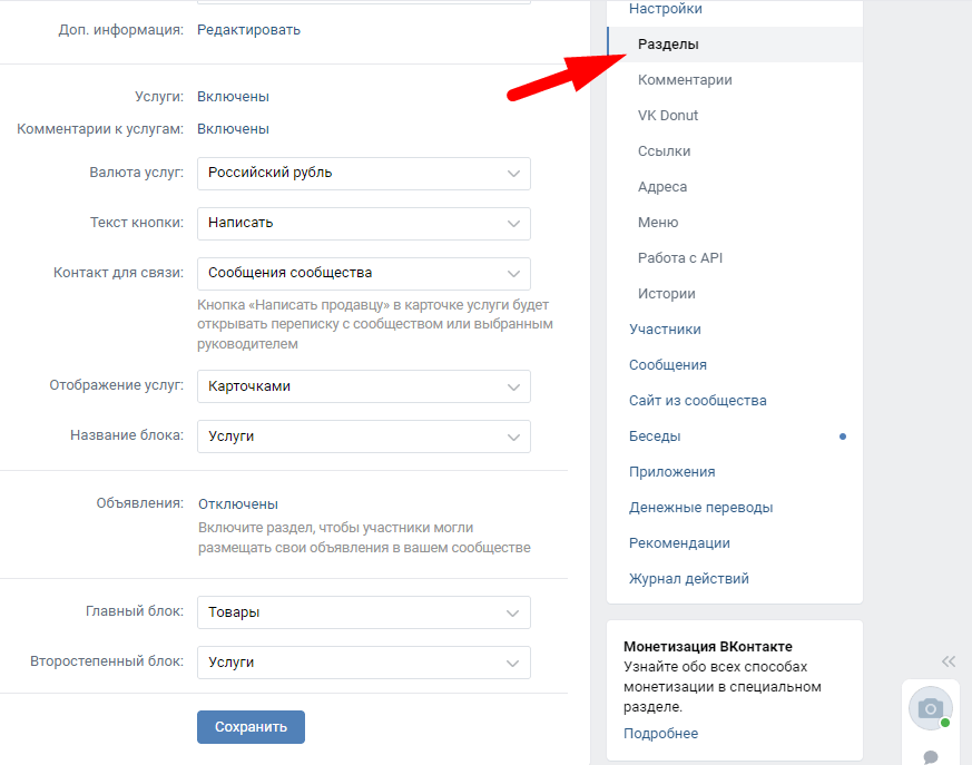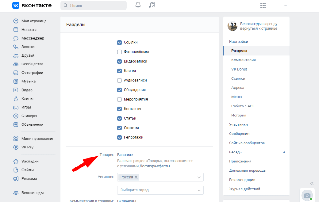 Чтобы перейти к товарам, зайдите в настройки вашего сообщества и кликните по разделам.