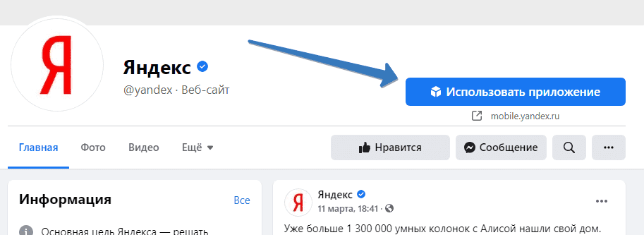 На скриншоте пример страницы Яндекса в Facebook с ссылкой на их приложение: