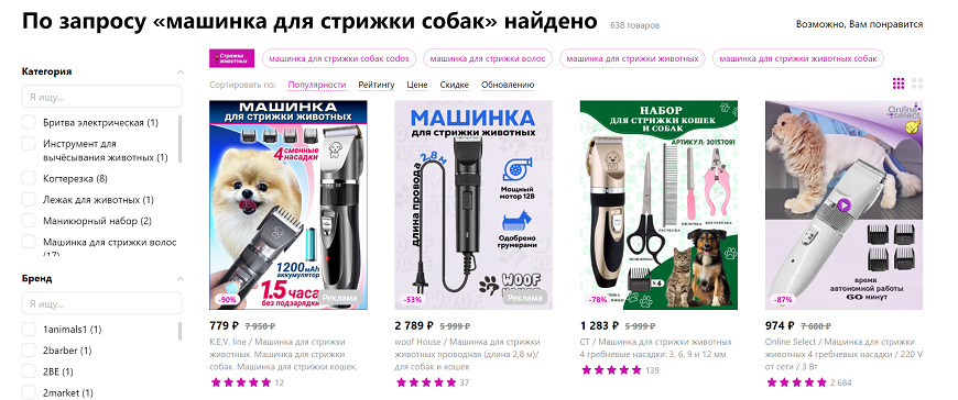 Другое дело — условные машинки для стрижки собак. Спрос на них есть, а конкурентов, по сравнению с предыдущим типом товара, не так уж и много (хотя тоже прилично).
