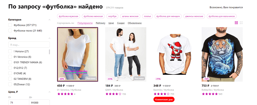 Анализировать спрос на товар и количество конкурентов можно прямо на самом Вайлдберриз. Я ввёл в поисковик маркетплейса слово «футболка» и мне высветилось 379 тысяч предложений. Следовательно, конкуренция огромная.