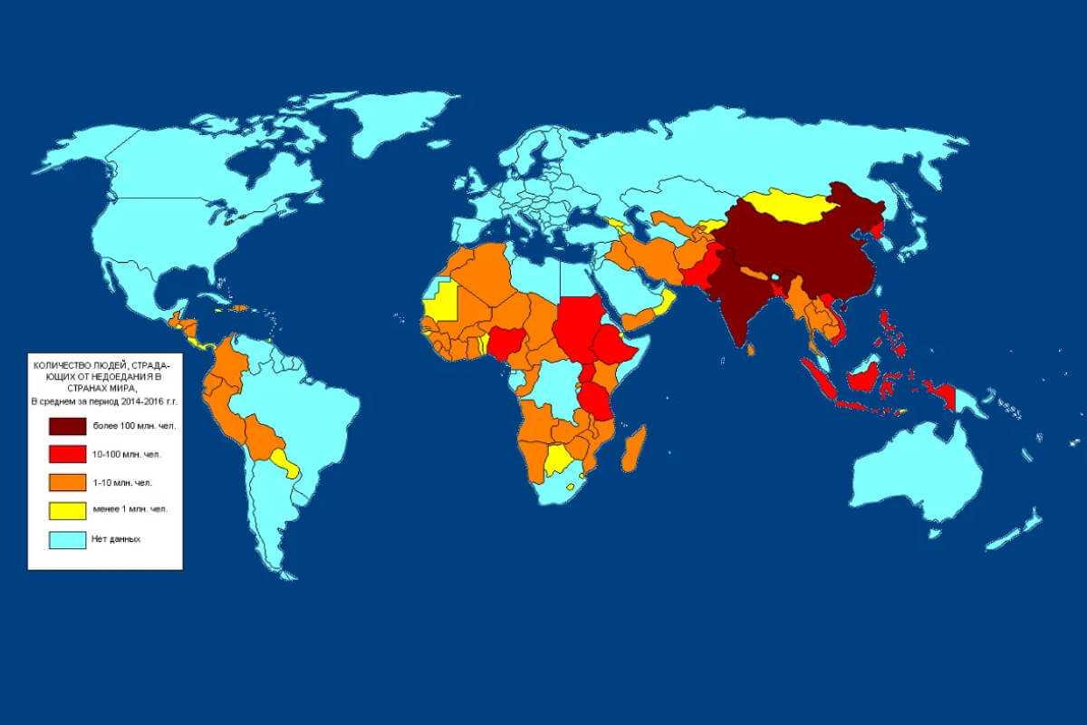 - Установлено, что 135 млн людей постоянно недоедают из-за экономической нестабильности, антропогенных факторов, глобального изменения климатических условий. Следующая распространенная причина — социальное неравенство.