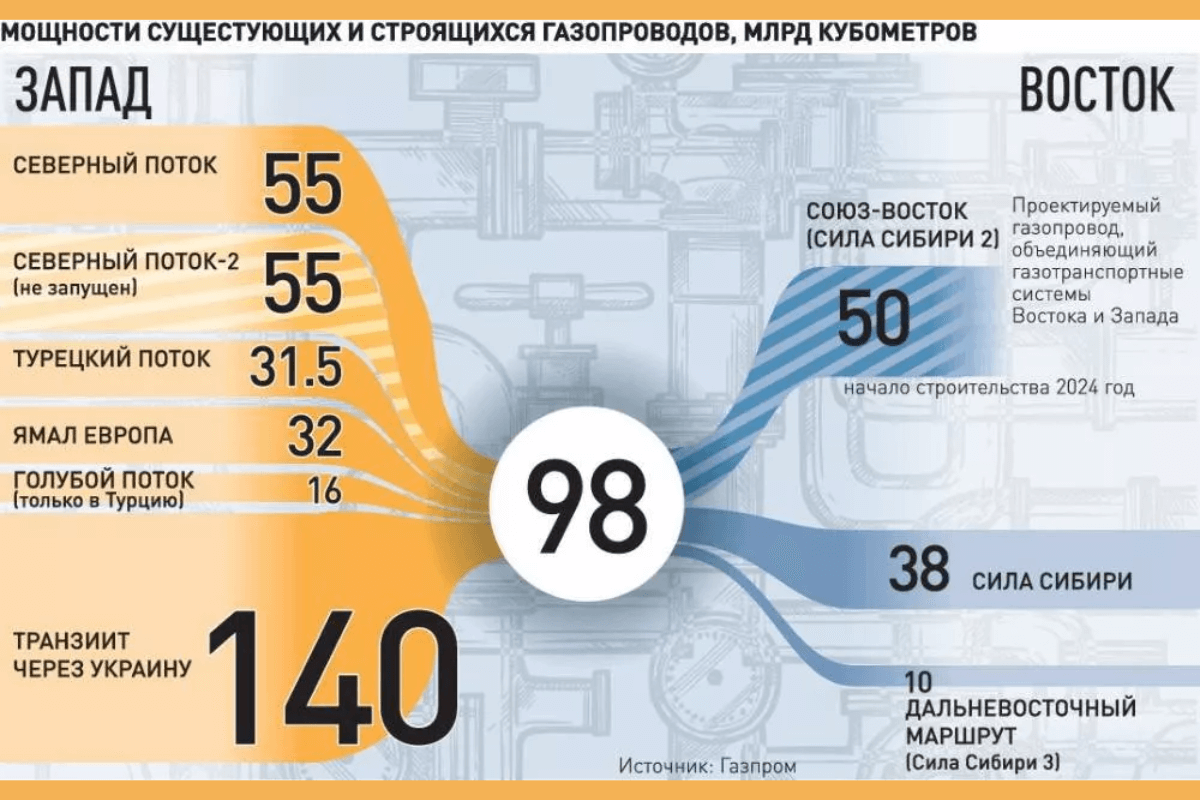 Мнения о том, что России нужно развивать сотрудничество с восточными странами, звучали не раз ещё и до введения санкций. Однако в Китай есть всего один газопровод «Сила Сибири». На проектную мощность в 38 млрд м3 его планируют вывести в 2025 году. Но проект для экспорта газа явно получился второстепенным, рассуждал на Российском нефтегазохимическом форуме в Уфе президент Союза нефтегазопромышленников России Геннадий Шмаль.