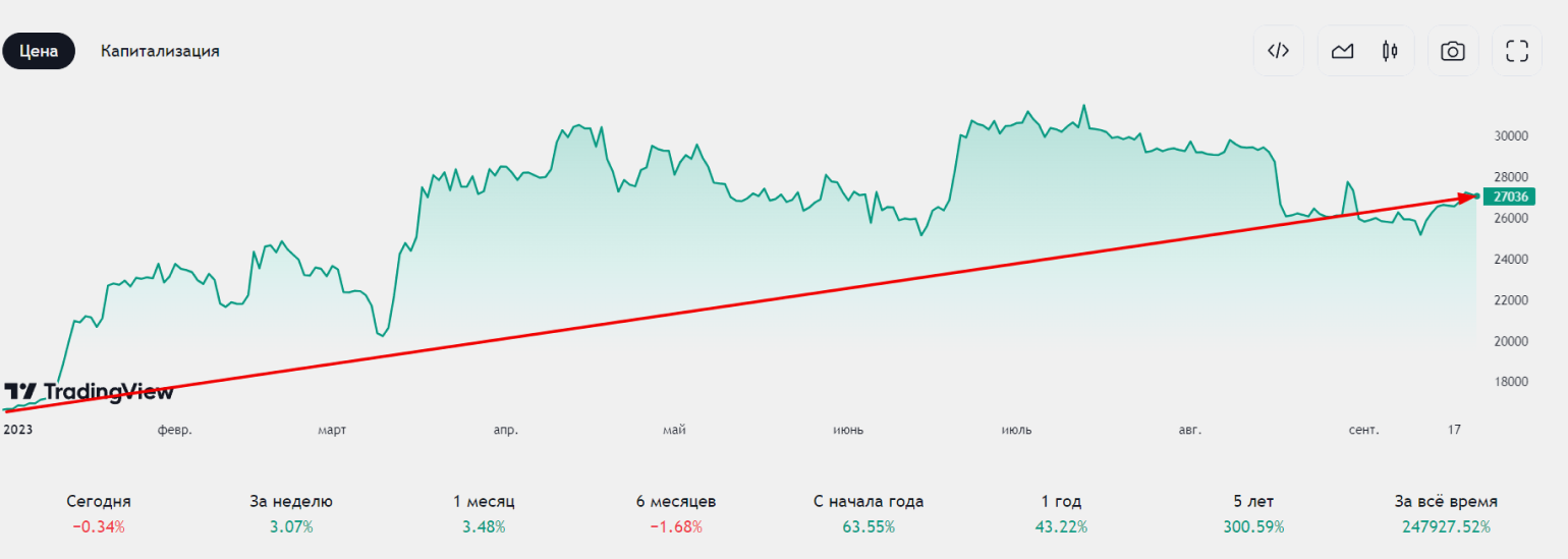 График котировок биткоина с января 2023 годаСкриншот: TradingView