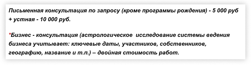 Астролог Оксана: 30 000 рублей за личную бизнес-консультацию. Можно было отказаться от устной и получить только записи на бумаге, тогда дешевле. Оплата также на банковскую карту.